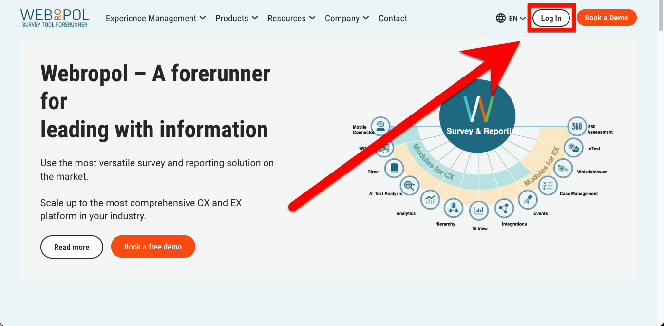 You can log in to Webropol at https://webropol.fi. This guide will provide you with basic information on how to log in to Webropol, its home directory system and how to change the language from within the system. If you need help with queries, event invitations or other functions, check out Webropol's own comprehensive help videos at https://new.webropolsurveys.com/TrainingVideos/Home (English only).