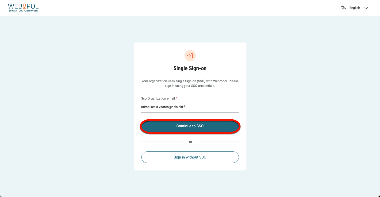 - In the email field, enter your email address in the format etunimi.sukunimi@helsinki.fi (e.g. raimo. keski-vaanto@helsinki.fi) as your Single Sign-on ("SSO") ID.