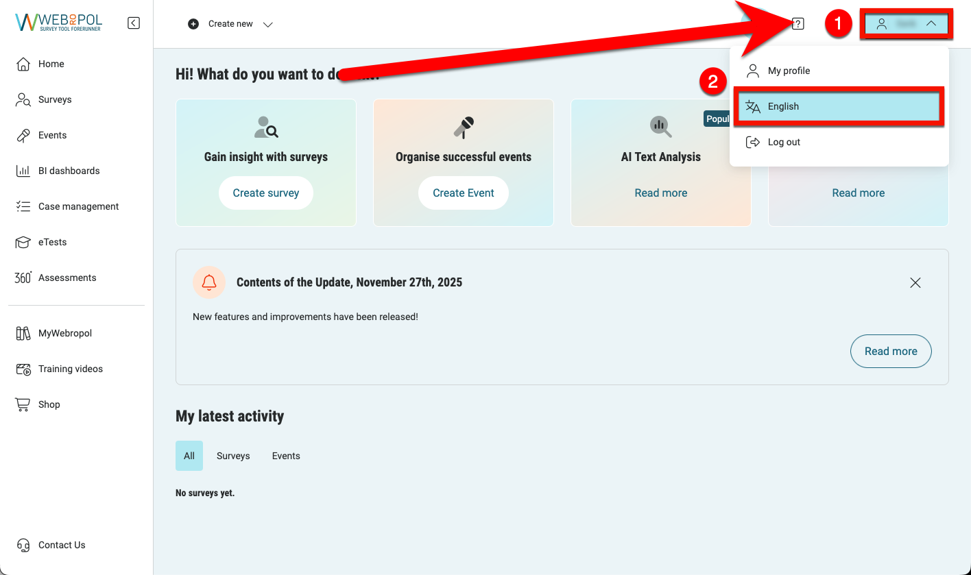 - To change the language of the service once you are logged in, first click (1) on your profile menu, then select (2) the language from the submenu that appears and click on it.