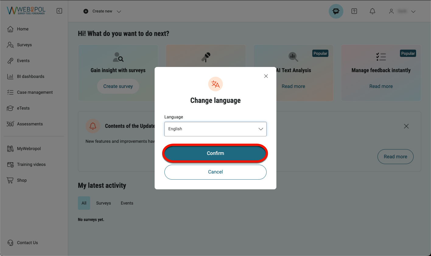 - Select the language you wish to use from the "Change language" menu that appears and click " Confirm ".