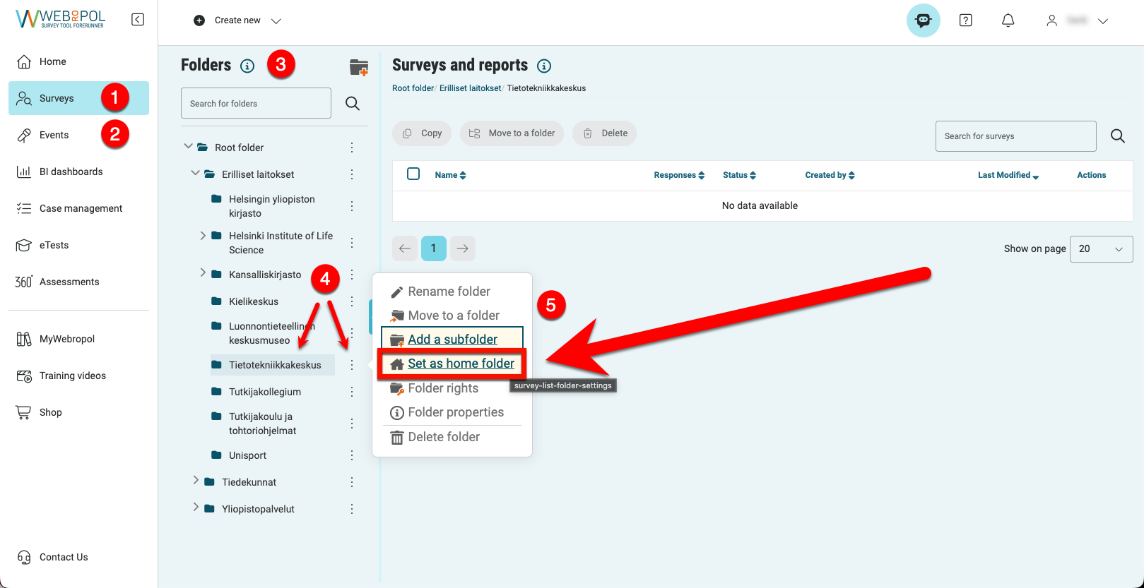 - Select (1) Surveys ("Surveys") or (2) Event Management ("Event"). The (3) Folders view will appear. Find your institution or unit in the list of units and (4) click on the three-dot icon behind it. From the menu that appears, select (5)"Set as home folder".