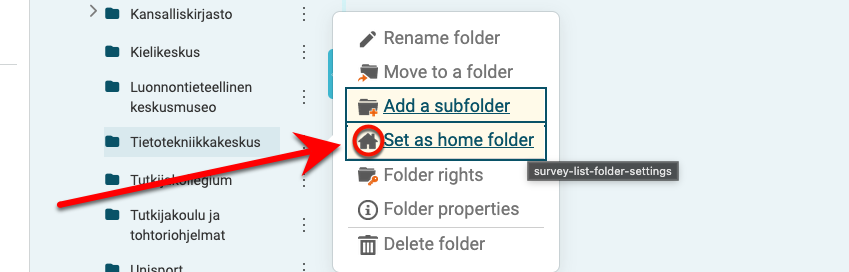 Note! Separate home folders are defined for queries and event management, so be sure to do this for both separately. You can identify your selected home folder by the cottage-shaped icon next to it.