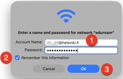 - Voit napsauttaa ruksin ruutuun Muista nämä tiedot (Remember this information) (2), ja jatkossa yhteys muodostuu automaattisesti kun olet eduroamin kuuluvuusalueella.