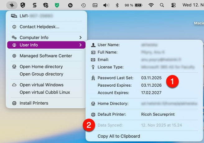 Huomioi, että salasanaa vaihdettaessa Mac-koneen pitää olla yliopiston verkossa, eli Helsingin yliopiston tiloissa eduroam-verkossa, lankaverkossa tai yliopiston ulkopuolelta EduVPN-yhteydessä yliopiston verkkoon (split-tunnel-yhteys riittää).