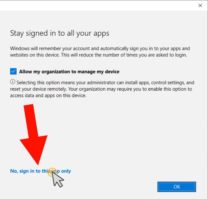 Huom! Kun sinulta kysytään että pysytäänkö kirjautuneena kaikissa M365-ohjelmissa (Stay signed in to all your apps), vastaa Ei, kirjaudu vain tähän ohjelmaan (No, sign in to this app only).
