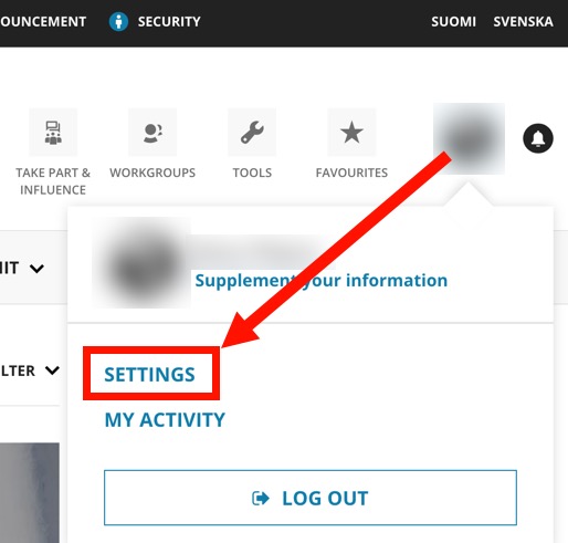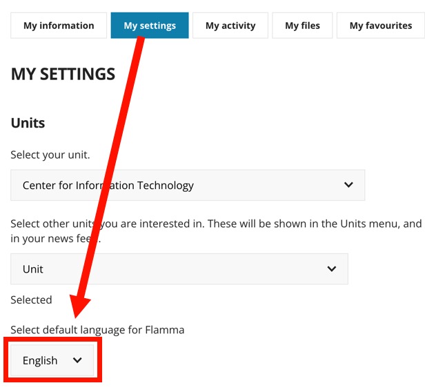 Saavut Asetukseni (My settings) -välilehdelle. Etsi kohta Valitse Flamman oletuskieli (Select default language for Flamma) ja valitse alasvetovalikosta haluttu kieli. Vaihtoehtoina ovat suomi, ruotsi ja englanti.