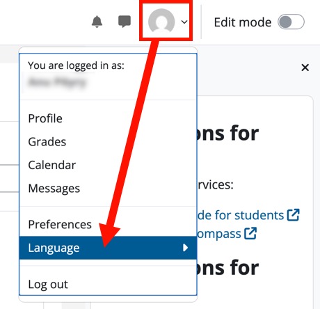 - Moodleen kirjautumisen jälkeen napsauta profiilikuvakettasi ja napsauta avautuvasta valikosta Kieli (Language).
