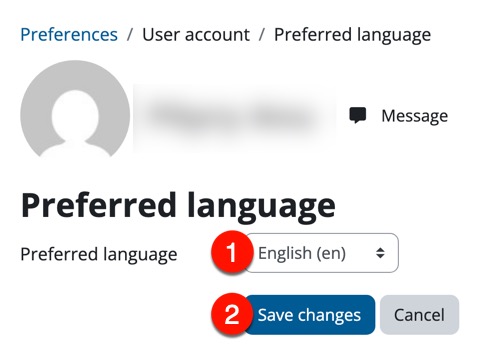 - Valitse avauvasta ikkunasta alasvetovalikosta (1) haluttu kieli. Vaihtoehdot suomi, ruotsi, englanti. Tallenna muutokset (2), niin Moodle muistaa valinnan myös seuraavassa kirjautumisessa.