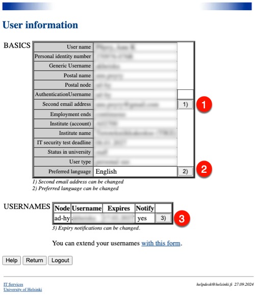 Kirjautumisen jälkeen pääset katselemaan käyttäjätietojasi. Numeroidut kohdat ovat itse muutettavissa, muut tiedot voi vaihtaa vain Helpdeskin avustuksella.